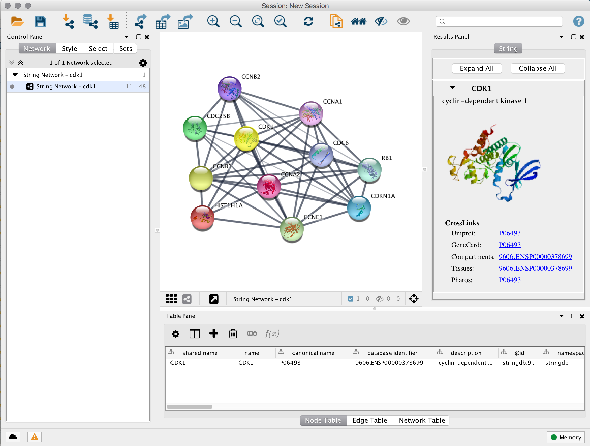 stringApp also allows users to change the confidence score, the type of interactions, and to expand the resulting network by adding an arbitrary number of nodes; this can be either proteins from the same organism, proteins involved in virus--host interactions, or chemical compounds. All STRING networks are visualized using a new "String Style" custom graphic, which closely resembles the networks on the STRING web site.